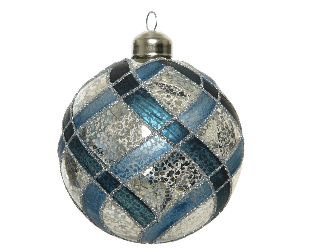 Box of 3 blue/silver glass baubles with white organza ribbon hanger. 8cm diameter