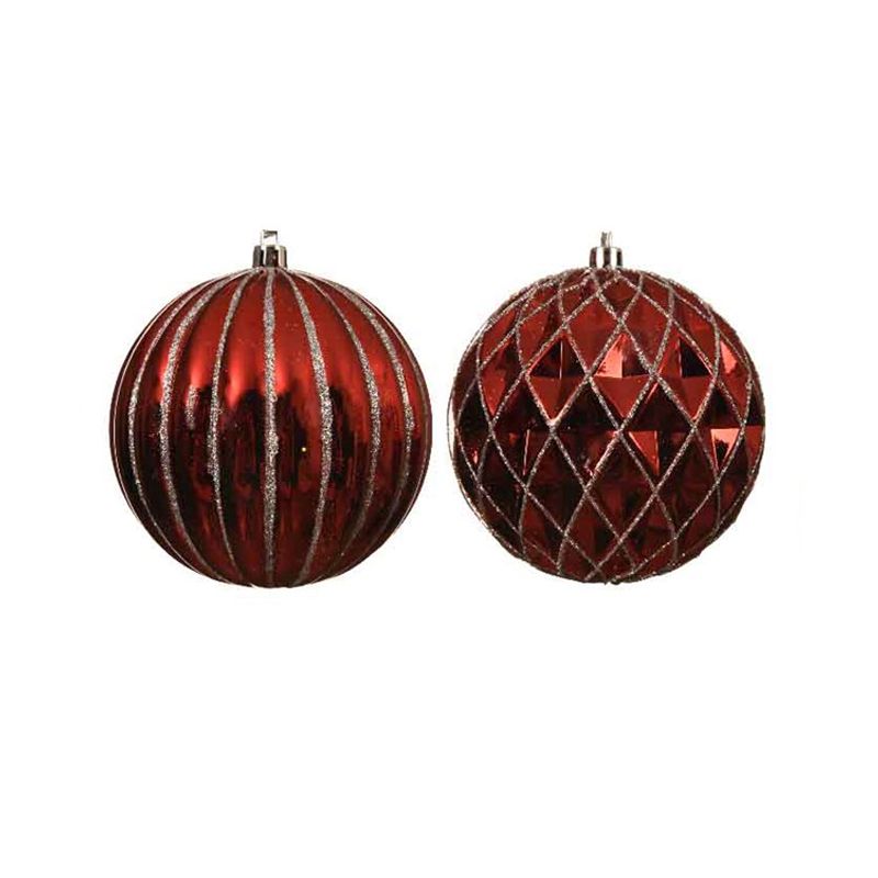Beautiful red bauble with a diameter of 10cm decorated with gold stripes and diamond shapes. Sold individually.