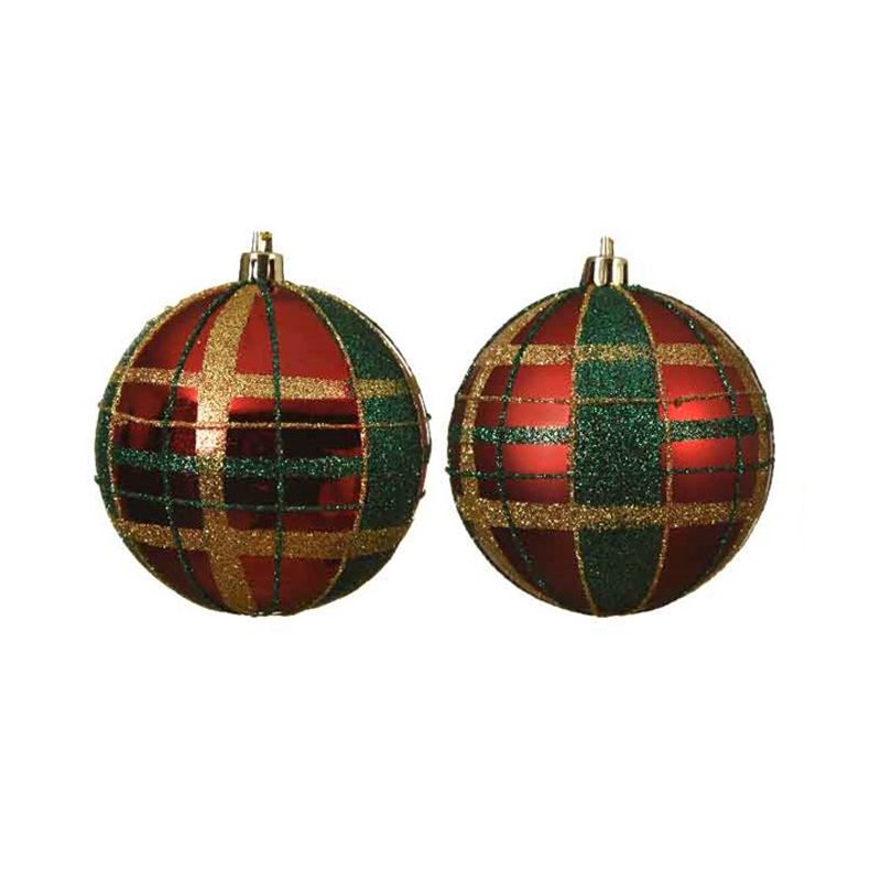 Beautiful red bauble with a diameter of 8cm decorated with gold and green glittered plaid. Sold individually.