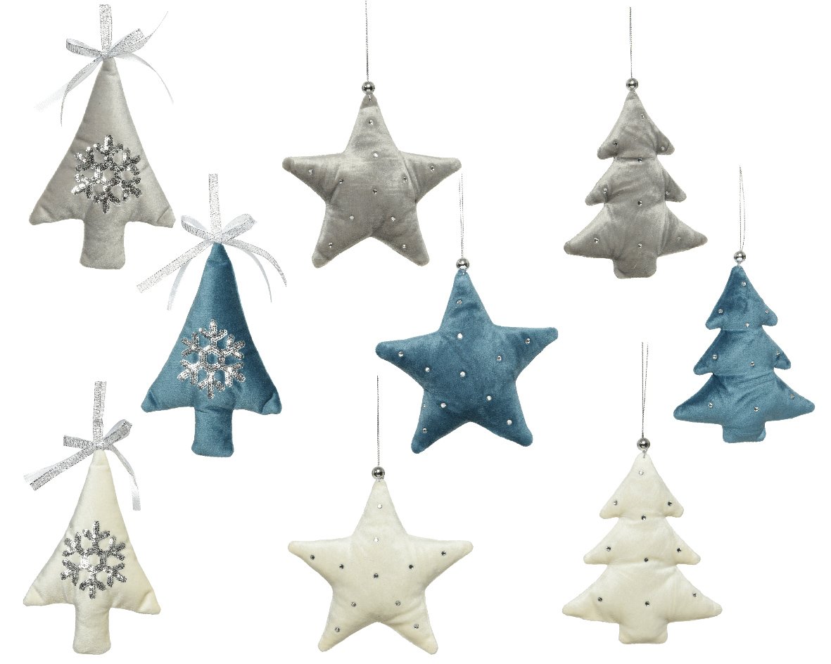 Hanging decorations. Choose from tree , snowflake or star in offwhite, grey or blue