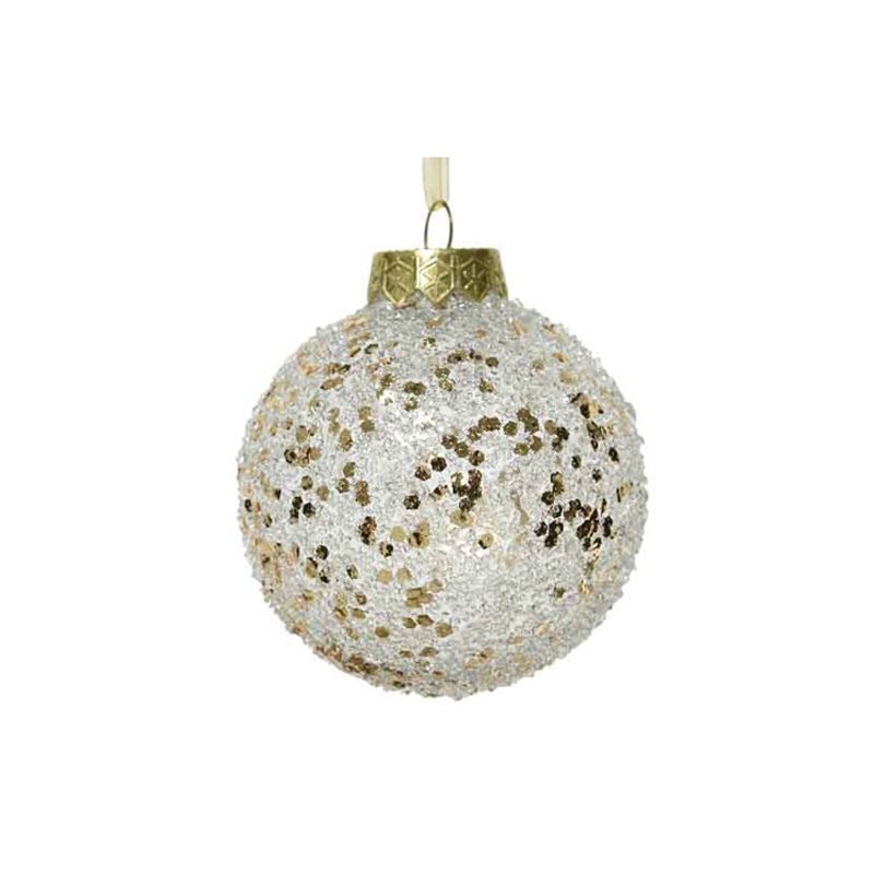A bauble decorated with sequins in a white and gold colour that will shimmer and shine in your Christmas tree. Sold individually.