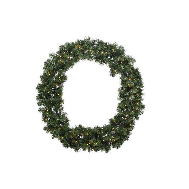 A natural looking Christmas wreath made with artificial green foliage and battery-operated warm-white lights that can be used both indoors and outdoors. The wreath has a diameter of 35cm and a length of 20cm.